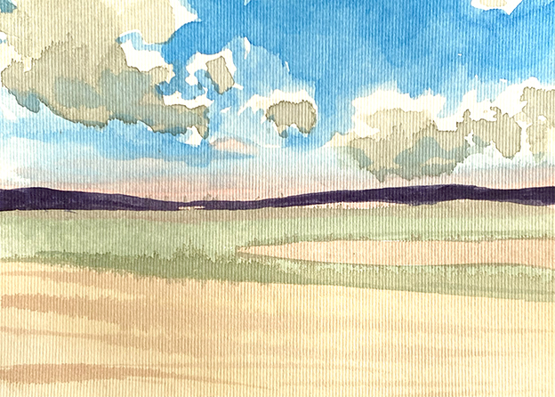 Paisaje viajado. Acuarela sobre un tarjetón reciclado. 10 x 21 cm